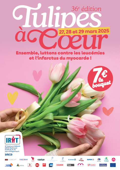 Cette opération consiste à vendre dans tous les hôpitaux, hypermarchés, supermarchés et sur la voie publique, des bouquets de tulipes au bénéfice de l’IRHT de Mulhouse. Elle permet de financer en partie des travaux de recherche qui portent essentiellement sur les cellules souches sanguines adultes, d’abord utilisées pour le traitement des leucémies et de certains cancers, et plus récemment pour la 1ère fois au monde, pour la réparation de la lésion cardiaque après infarctus du myocarde sévère. Les applications thérapeutiques des recherches bénéficient évidemment en priorité aux malades de notre région.